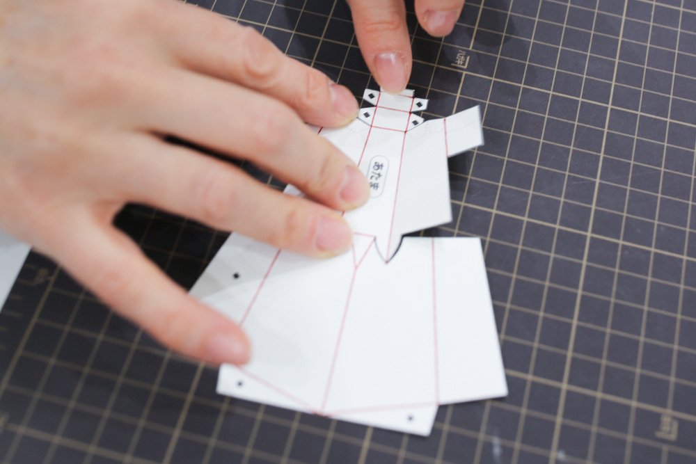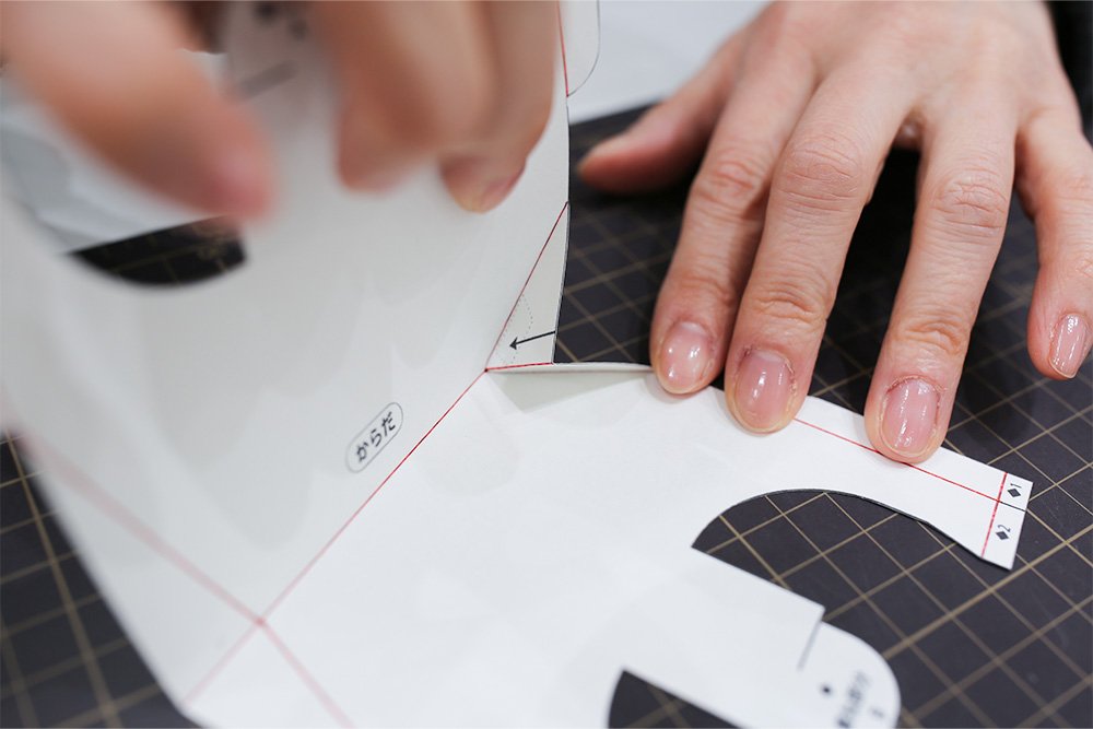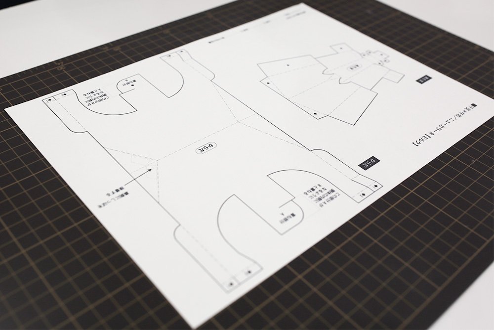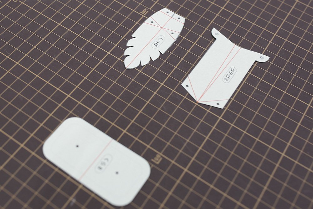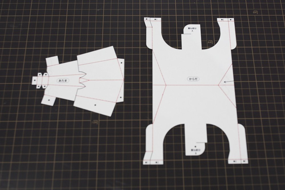 ミルク色の紙に[あたま]と[からだ]の型紙をプリントします。「切る実線」と「山折り・谷折りの線」の場所を確認します。