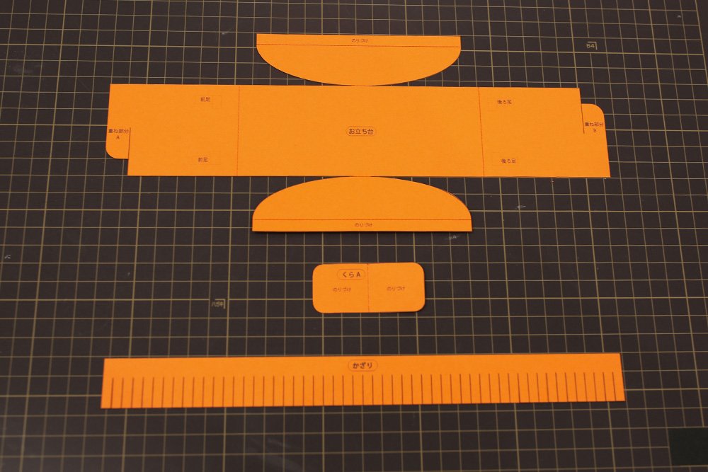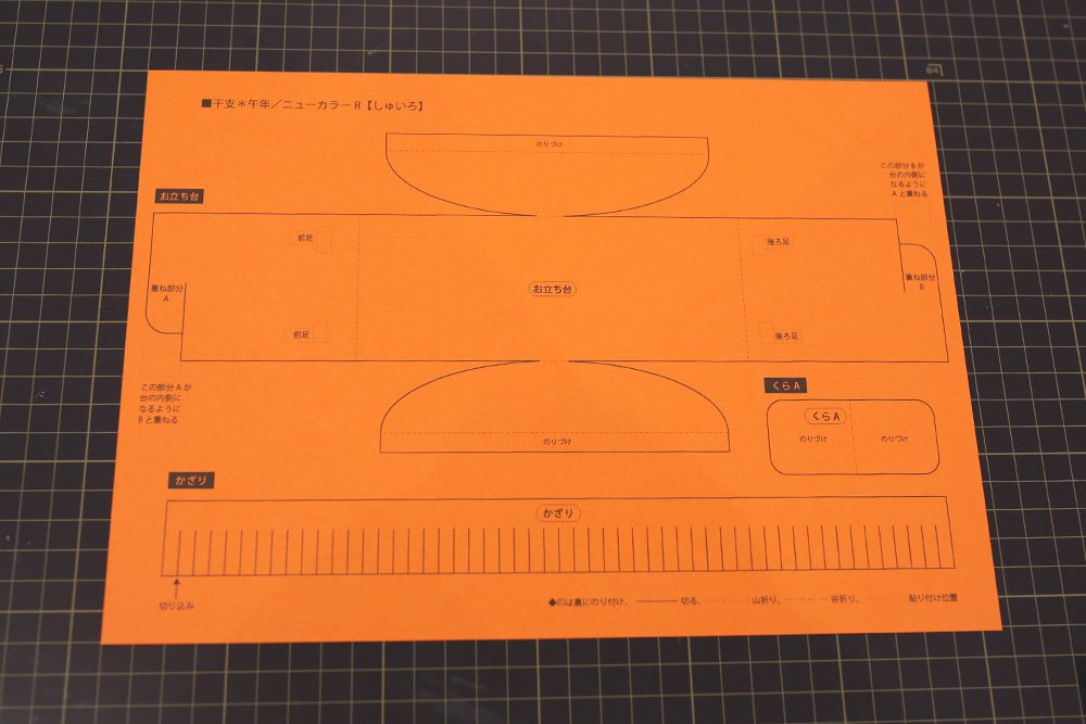 しゅいろの紙に[お立ち台][かざり][くらA]の型紙をプリントします。「切る実線」と「山折り・谷折りの線」の場所を確認します。同様に折り線を赤ボールペンでなぞって折り癖をつけます。