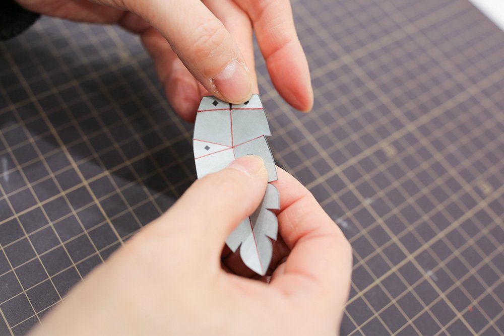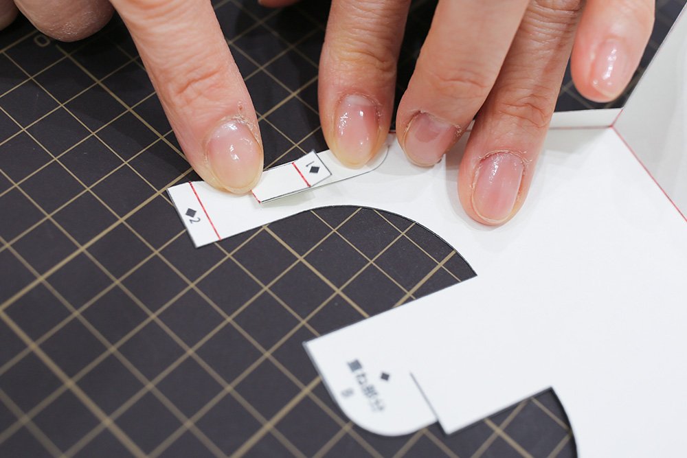 ミルク色のパーツ[あたま]の折り線を折り、「◆印」の裏側にのりを付けて、口元を組み立てます。