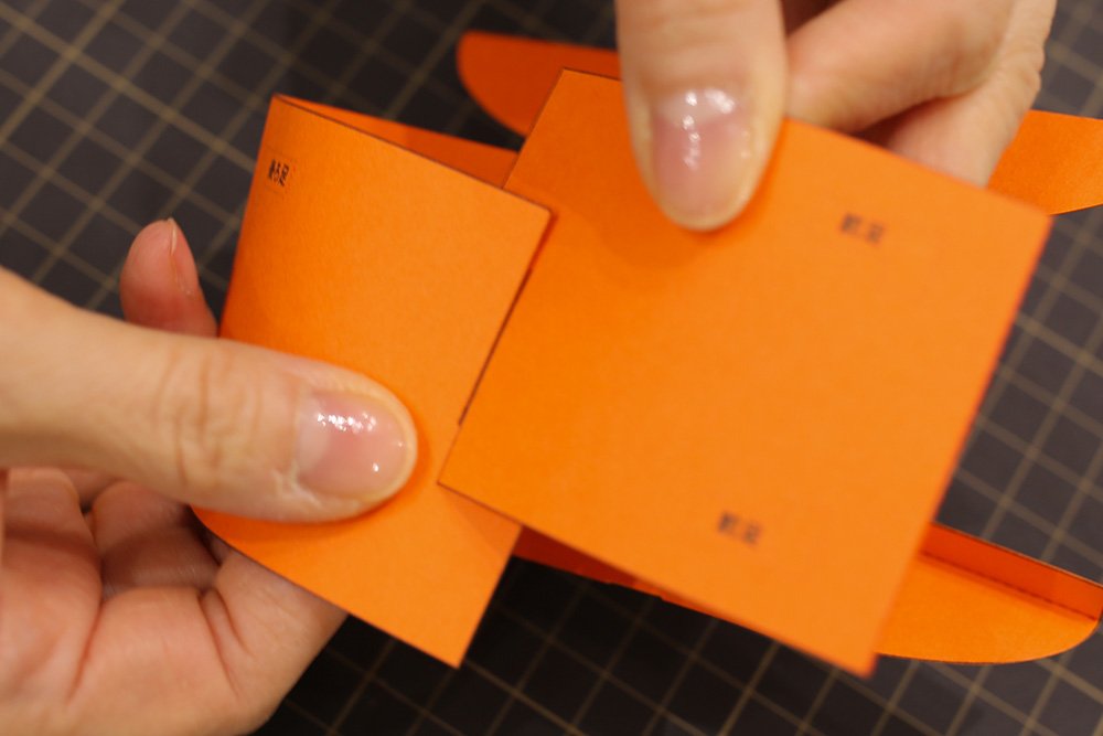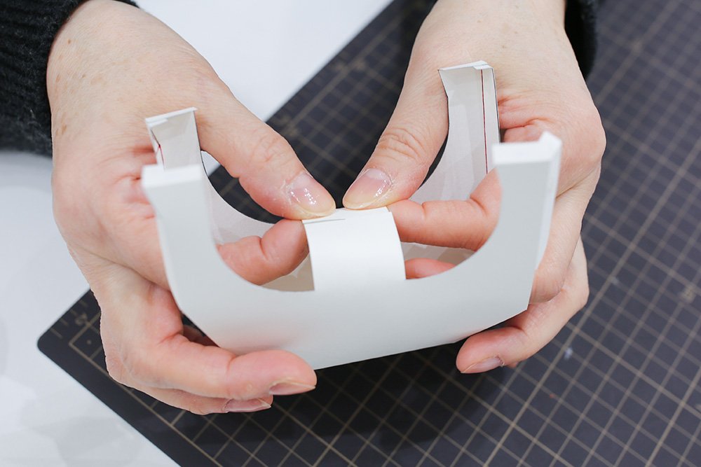 しゅいろのパーツ[お立ち台]の折り線を折ります。天板部分は「重ね部分A」と「重ね部分B」が台の内側に入るように、切り込みを交差させてのりづけします。