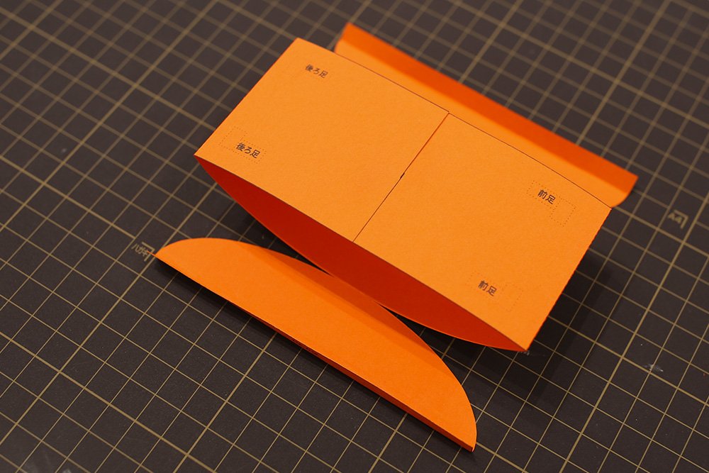 組み立てた午の足元「◆1」と「◆2」の裏側にのりを付け、お立ち台の天板にある指定の場所にしっかりと貼り付けます。