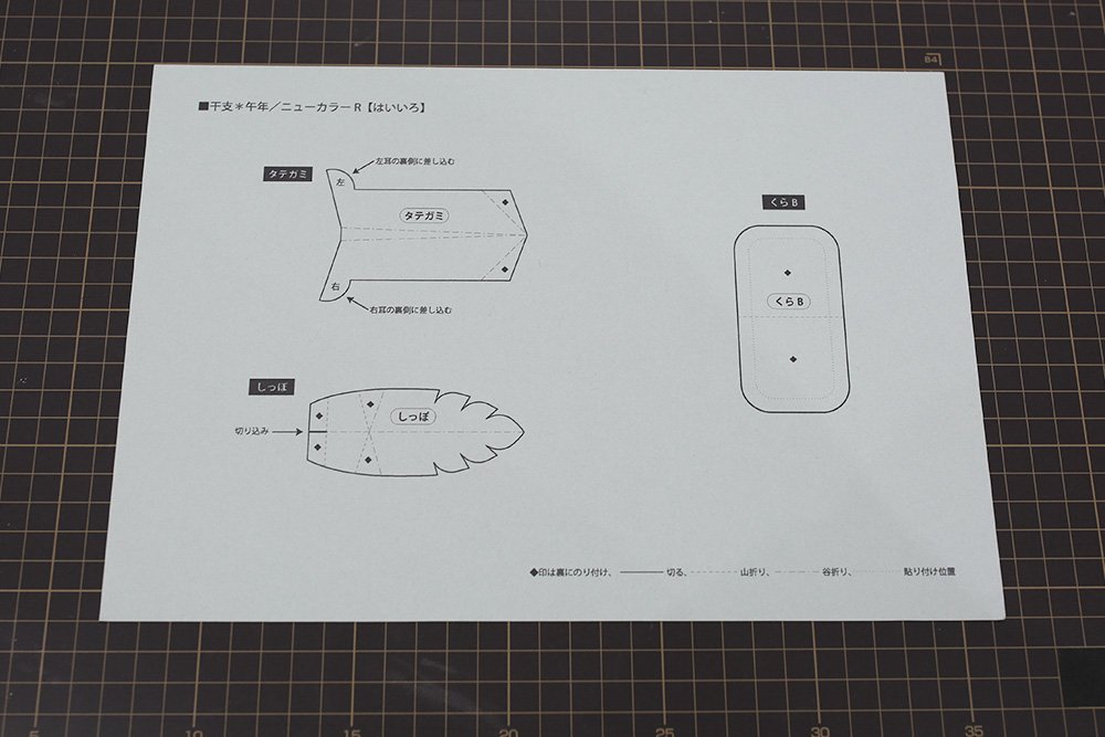 はいいろの紙に[タテガミ][しっぽ][くらB]の型紙をプリントします。「切る実線」と「山折り・谷折りの線」の場所を確認します。