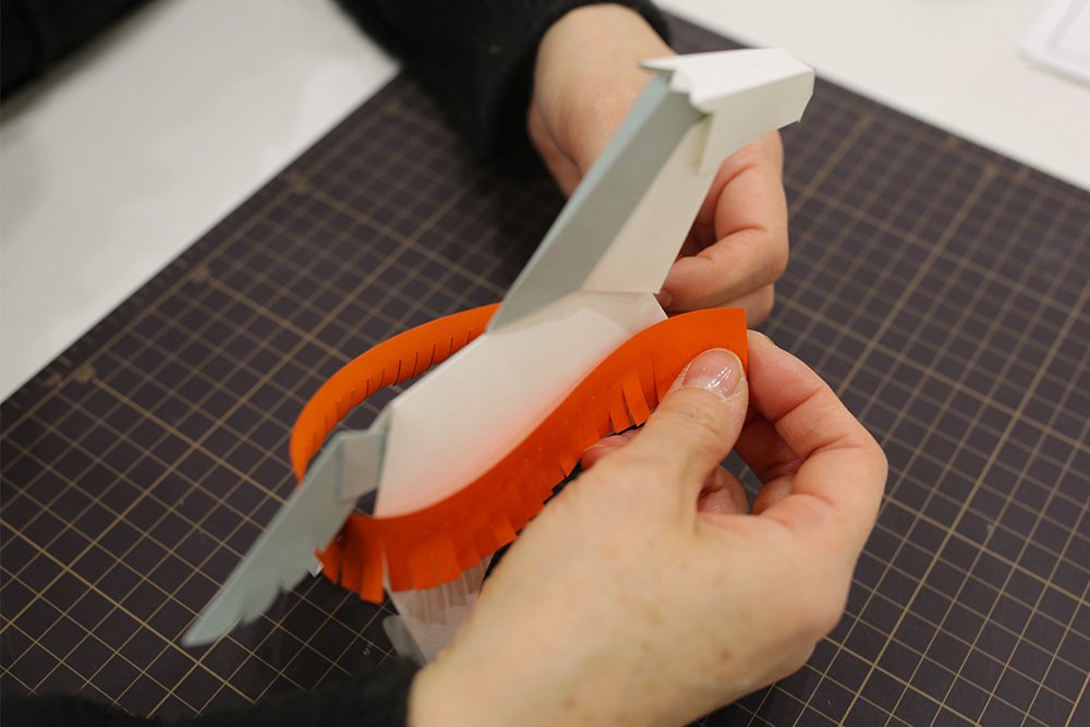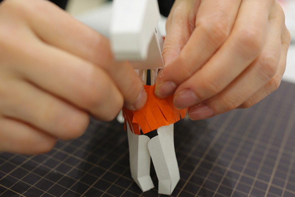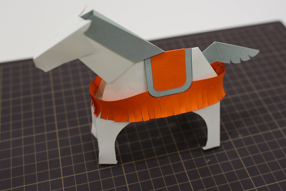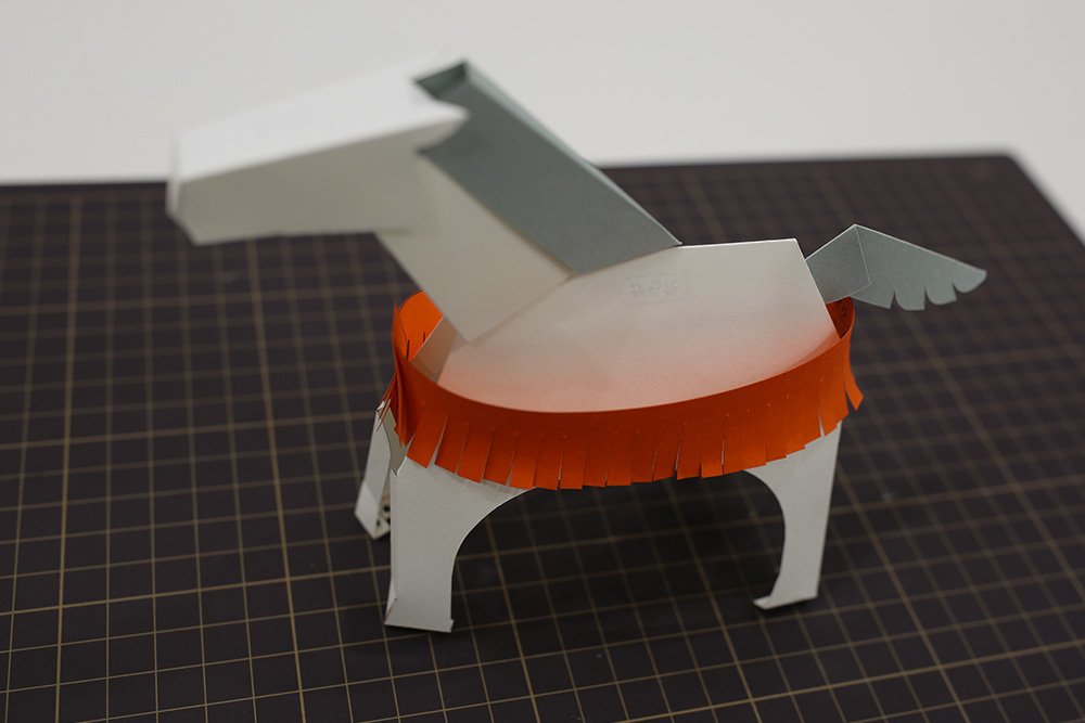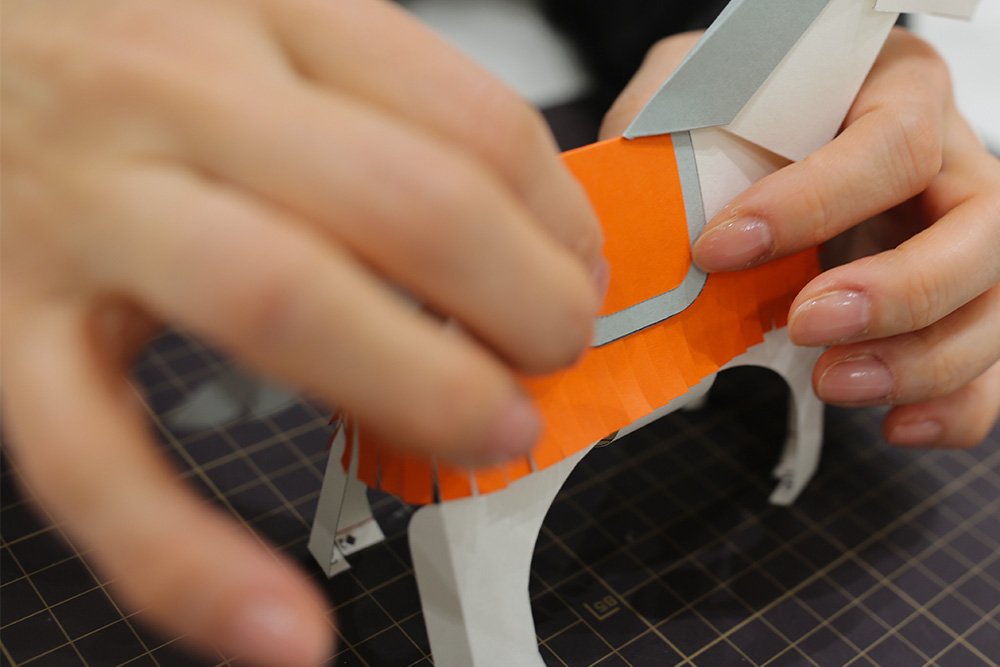 はいいろのパーツ[タテガミ]の折り線を折り、「◆印」の裏側にのりを塗ります。先端の凸部分を午の耳の後ろにある穴に差し込んでから、首の付け根から背中にかけて貼り合わせます。