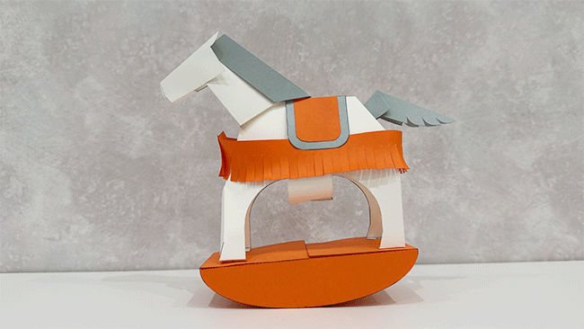 しゅいろの[くらA]を折り、全体にのりを付けて、はいいろの[くらB]に重ねて接着します。これを午の背中(タテガミの下をくぐらせる位置)に貼り付けます。